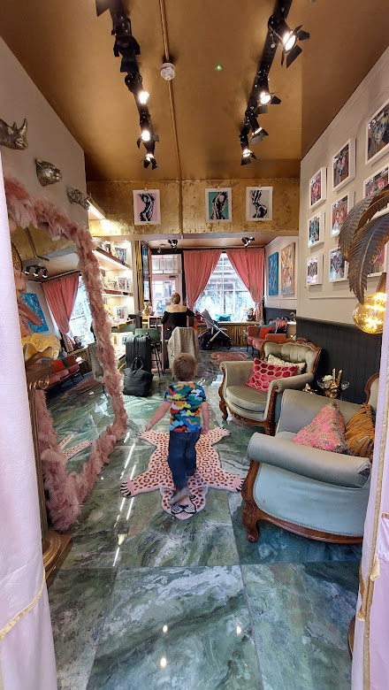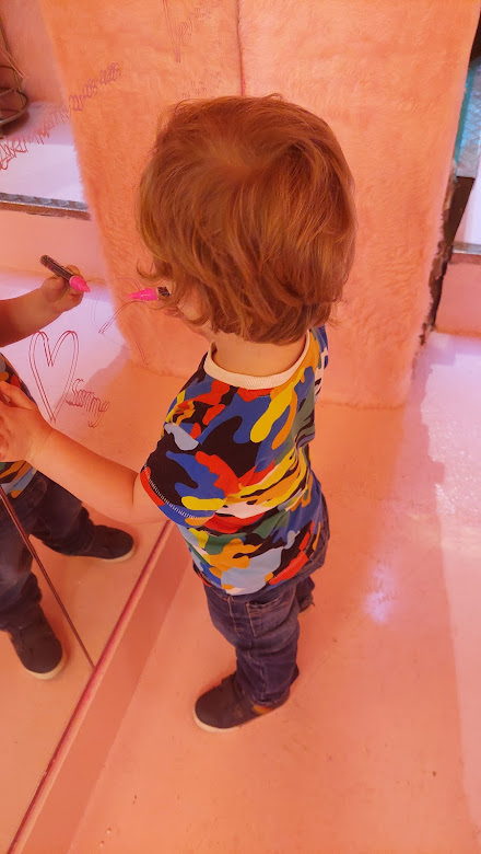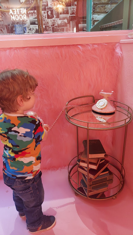 This is such a fab space for little ones. There’s places to sit, and it’s ok if they touch many things, and you get a lovely warm welcome from the staff here. We were able to leave our pram by the reception area, and there are a couple of mini flights of stairs to walk down. I particularly enjoyed the Smeg Fridge room! And LM loved writing with the pink pen on the mirror and using the telephones π